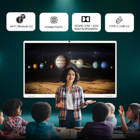 Android 14 (EDLA), 4K UHD clarity, 40‑point touch, and teacher‑centric tools.