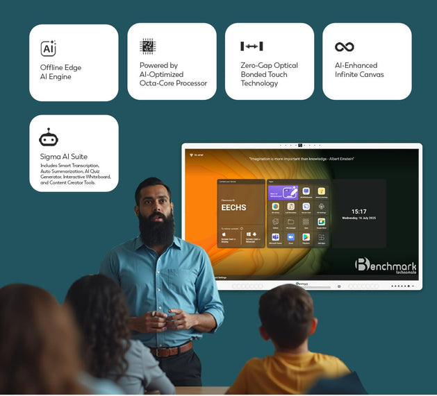 Discover the Benchmark Sigma AI A7 Pro – an AI‑powered interactive flat panel with Android 14 (EDLA), 4K UHD clarity, 40‑point touch, and teacher‑centric tools. Perfect for classrooms, YouTube studios, and hybrid learning.