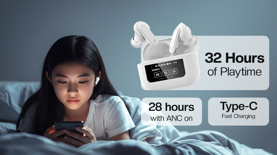 Get 32 hours of total playtime, or 28 hours with ANC mode active. Type-C fast charging ensures hours of use with just minutes of charge. Perfect for travel, long workdays, and endless playlists.